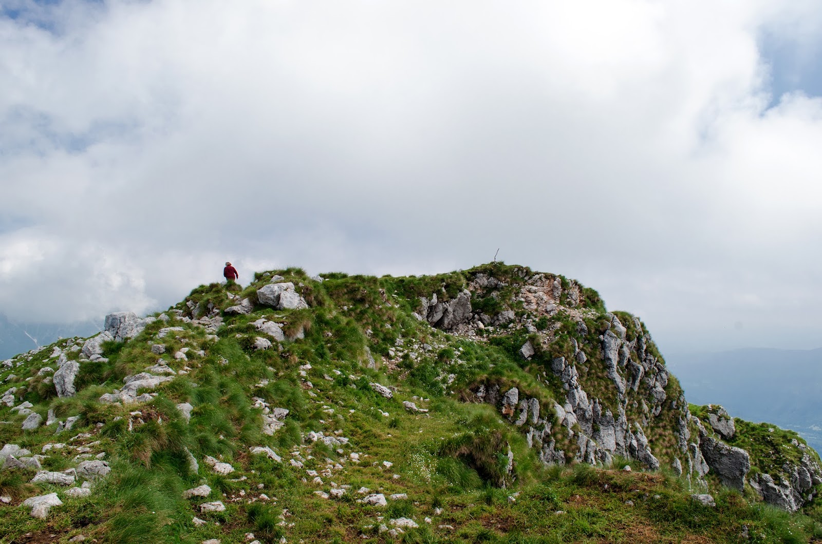 Appena il bosco si dirada, quando finalmente la vista può spaziare in cerca di panorami oltre la foschia, prima di affrontare i bellissimi prati del pendio occidentale ci fermiamo per una pausa. Poi via, adesso la pendenza aumenta, il sentiero sale a lunghi e verdi tornanti impreziositi di fiori. Il Monte Nero e la cresta del Vrata fanno parecchio fatica a venir fuori dalle nuvole, grigie, ma chiazze di azzurro e raggi di sole incoraggiano la nostra salita. Sotto di noi si vedono Dreznica e Caporetto. Miriamo alla cima e distrattamente non prendiamo in considerazione la deviazione per le interessanti postazioni di cannoni poste a pochi minuti dal sentiero principale. Quando me lo ricordo siamo ormai a pochi metri dalla cima che raggiungiamo dopo circa tre ore e passa. La cima è ampia e panoramica, cerchiamo un posto comodo per riposare, poi ci guardiamo attorno come ogni volta succede cercando di assorbire la